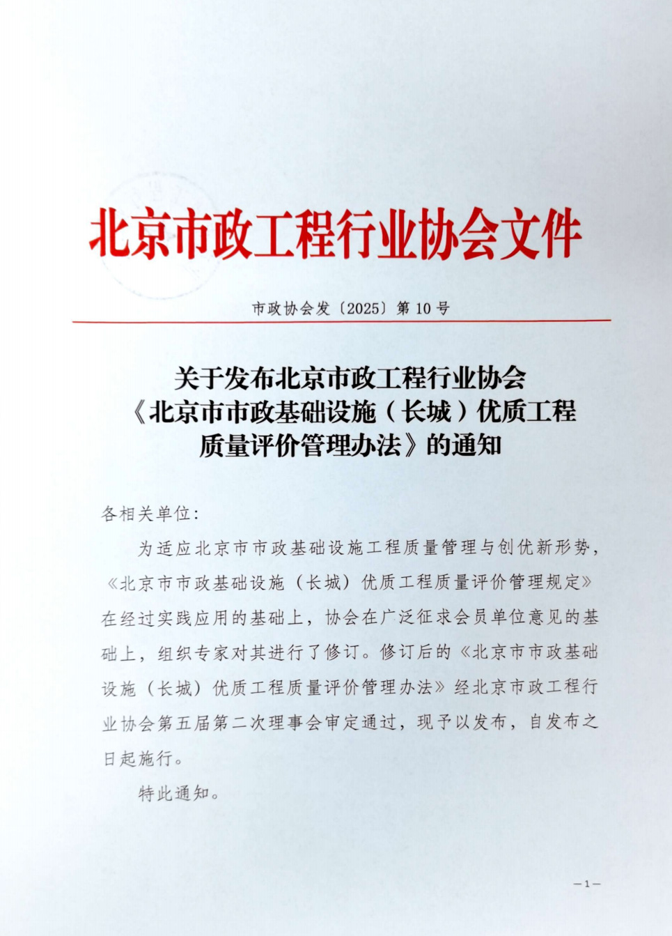北京市政工程行业协会 《北京市市政基础设施(长城)优质工程 质量评价管理办法》