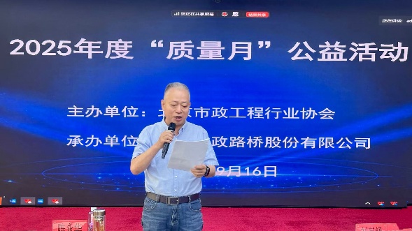 9月16日,以“夯实质量支撑,聚焦工程质量,铸就精品市政”为主题的2025年度“质量月”公益活动在市政路桥大厦举办,本次活动由北京市政工程行业协会主办、北京市政路桥股份有限公司承办。协会会员单位的技术质量代表100余人参加了现场会议,同时各会员单位组织观看了活动直播.